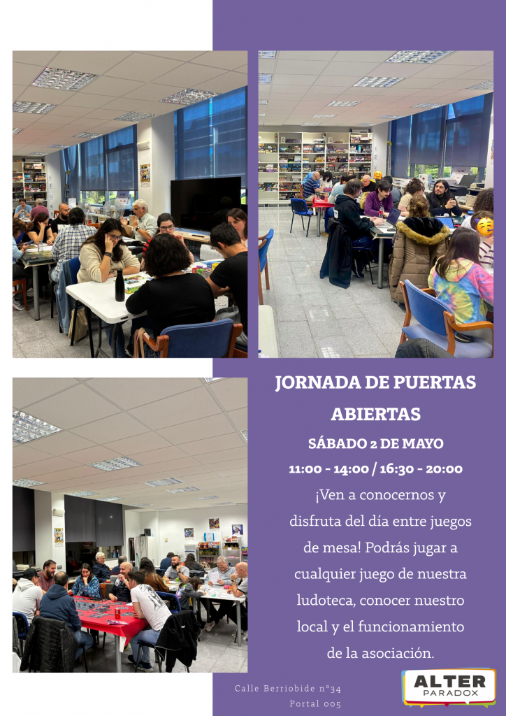Tras haber recibido varias peticiones... ¡Ya está aquí! Nueva jornada de puertas abiertas en nuestro local. Será el sábado 2 de mayo, estaremos tanto por la mañana de 11 a 14 como por la tarde de 16:30 a 20 para enseñaros el local, la ludoteca y el funcionamiento de la asociación.