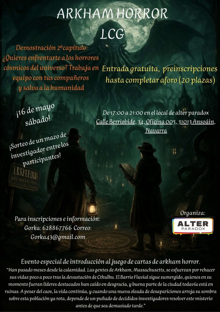 ¡El próximo 16 de mayo tenemos un evento muy especial en la asociación! Una introducción al juego de cartas Arkham Horror, muy querido entre nuestros socios.